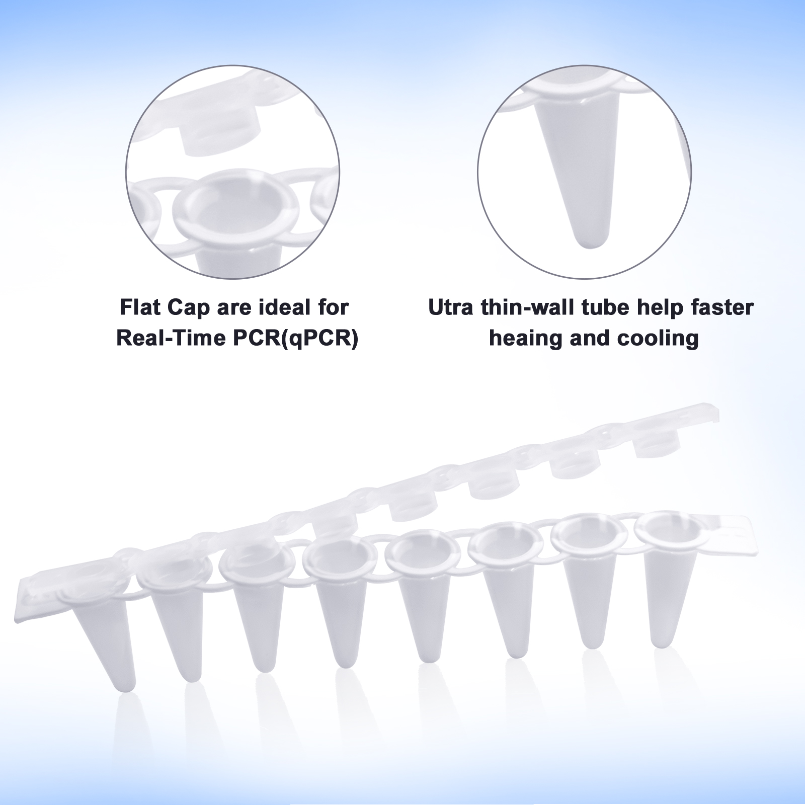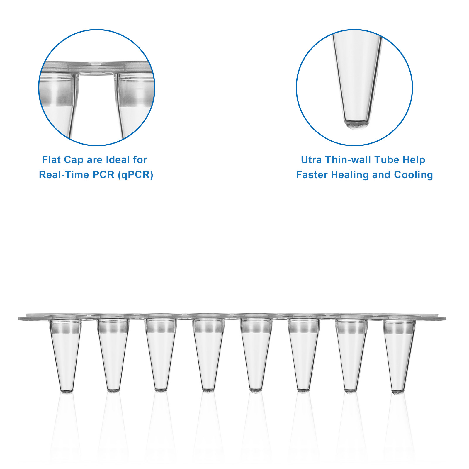 - Domed caps ensure efficient heat transfer, while flat caps are ideal for Real-Time PCR(qPCR); unique design prevents opening during cycling and incubation