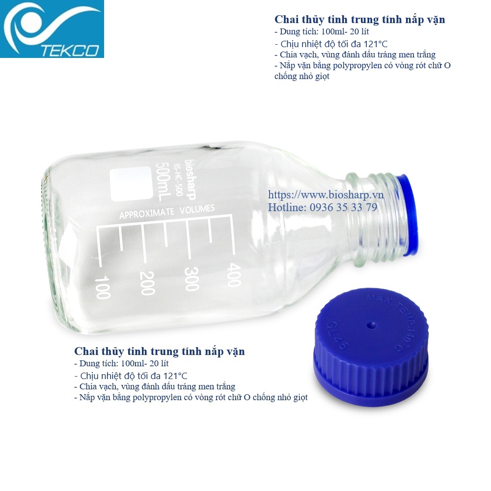 Chai thủy tinh trung tính của hãng Biosharp được sử dụng rộng rãi để chứa các loại chất lỏng khác nhau trong phòng thí nghiệm, với chất liệu dày hơn, niêm phong tốt, có vạch chia độ và kháng hóa chất.