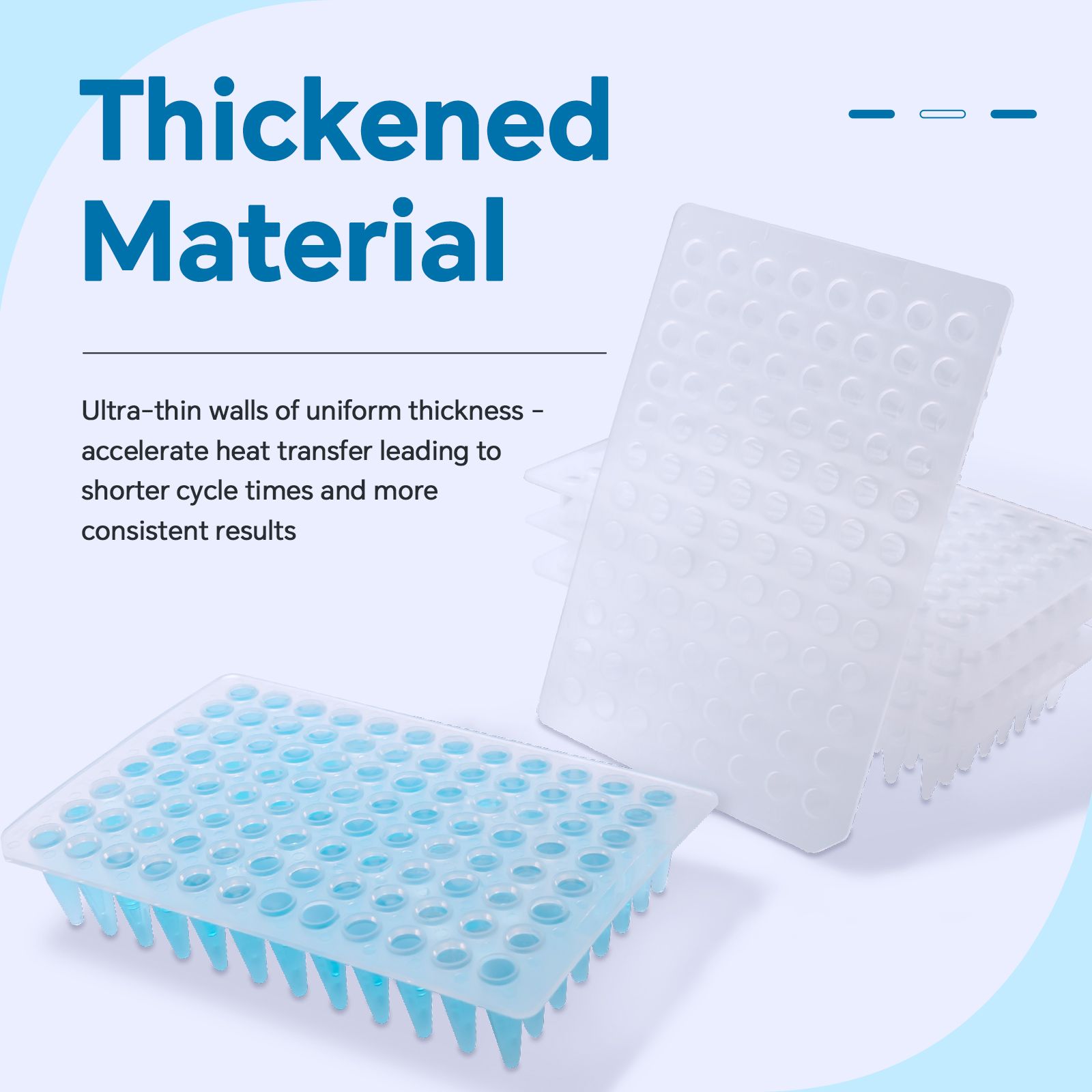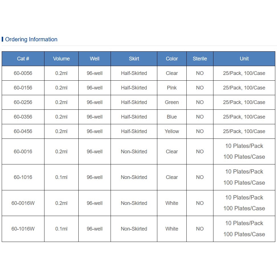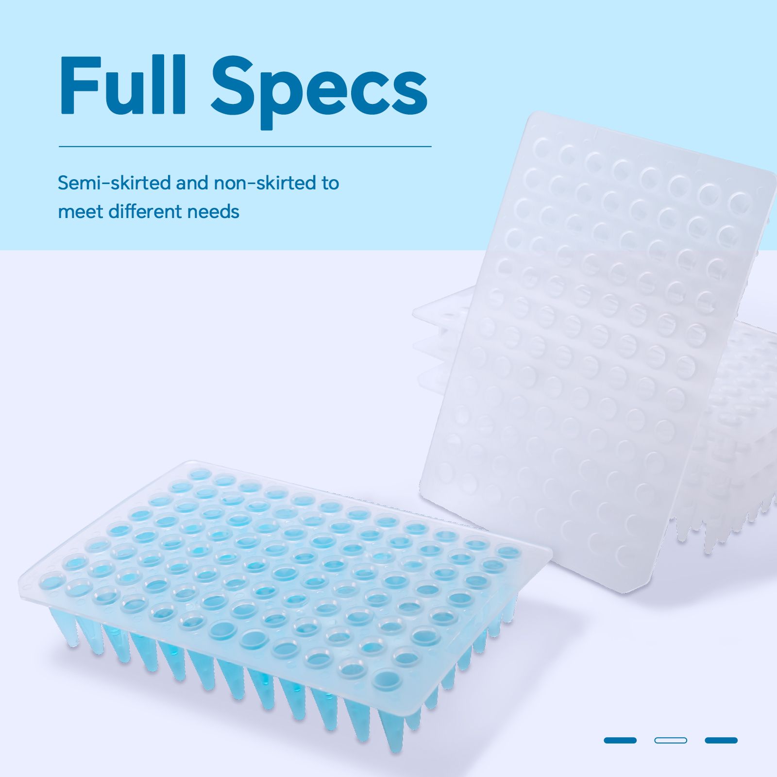 - Half-skirted plates are easy to insert and remove, non-skirted design is more adaptable, full skirted plate has PC material frame to enhance mechanical strength, making it excellent for use with robotic platforms in an automated workflow.