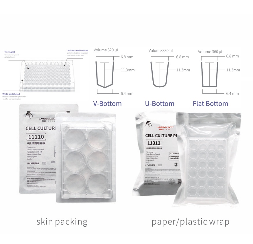 Labselect Cell Culture Plates are made of high-quality polystyrene materials, with strict process control, and ergonomic design. These plates are with flat bottom or U-bottom, lid with sealing ring, reducing evaporation and cross contamination. Individual alphanumeric codes for well identification. Safe and easy handling through pronounced corrugation of the plate and smaller lid. TC-treated and non-treated cell culture plates are available.