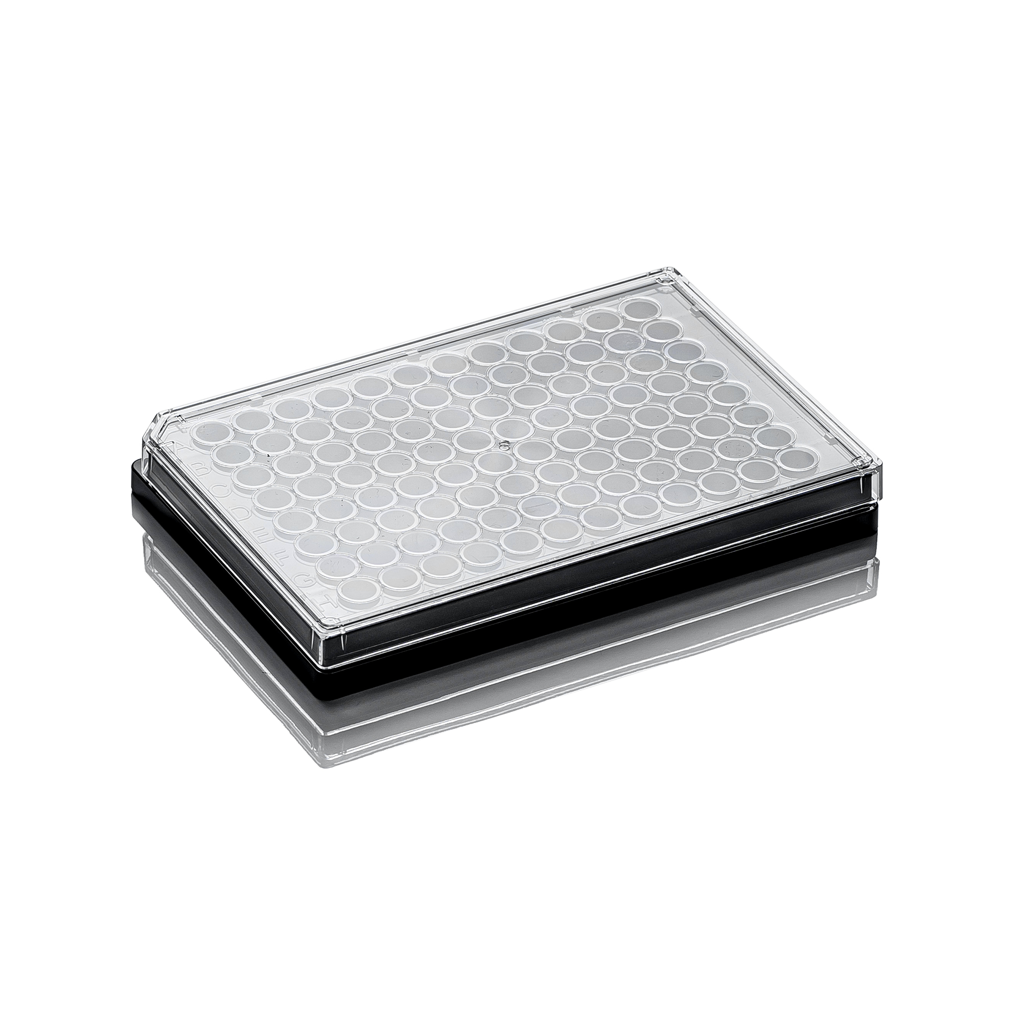 Đĩa nuôi cấy tế bào 96 giếng, khung đen, đáy phẳng màu đen, nắp trong suốt, TC-treated/non-treated