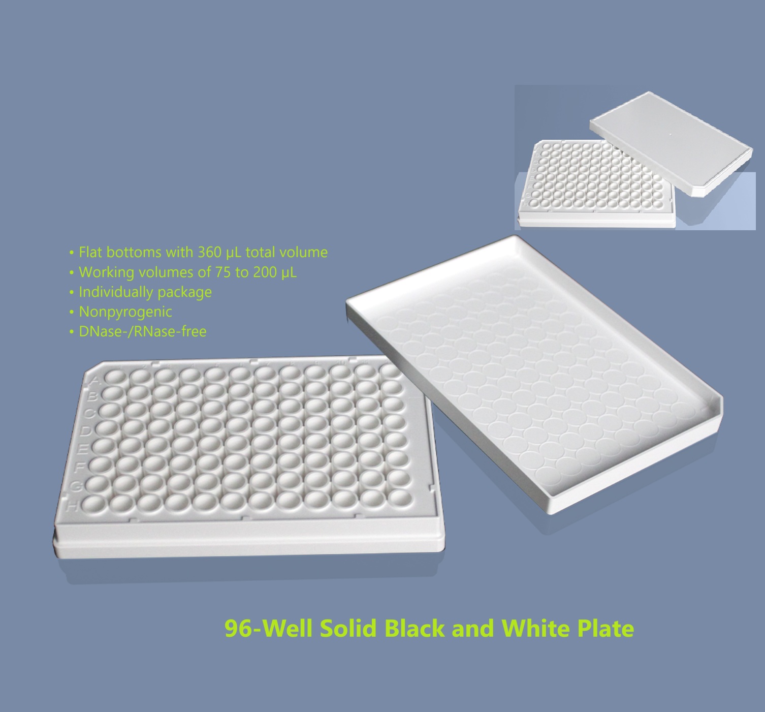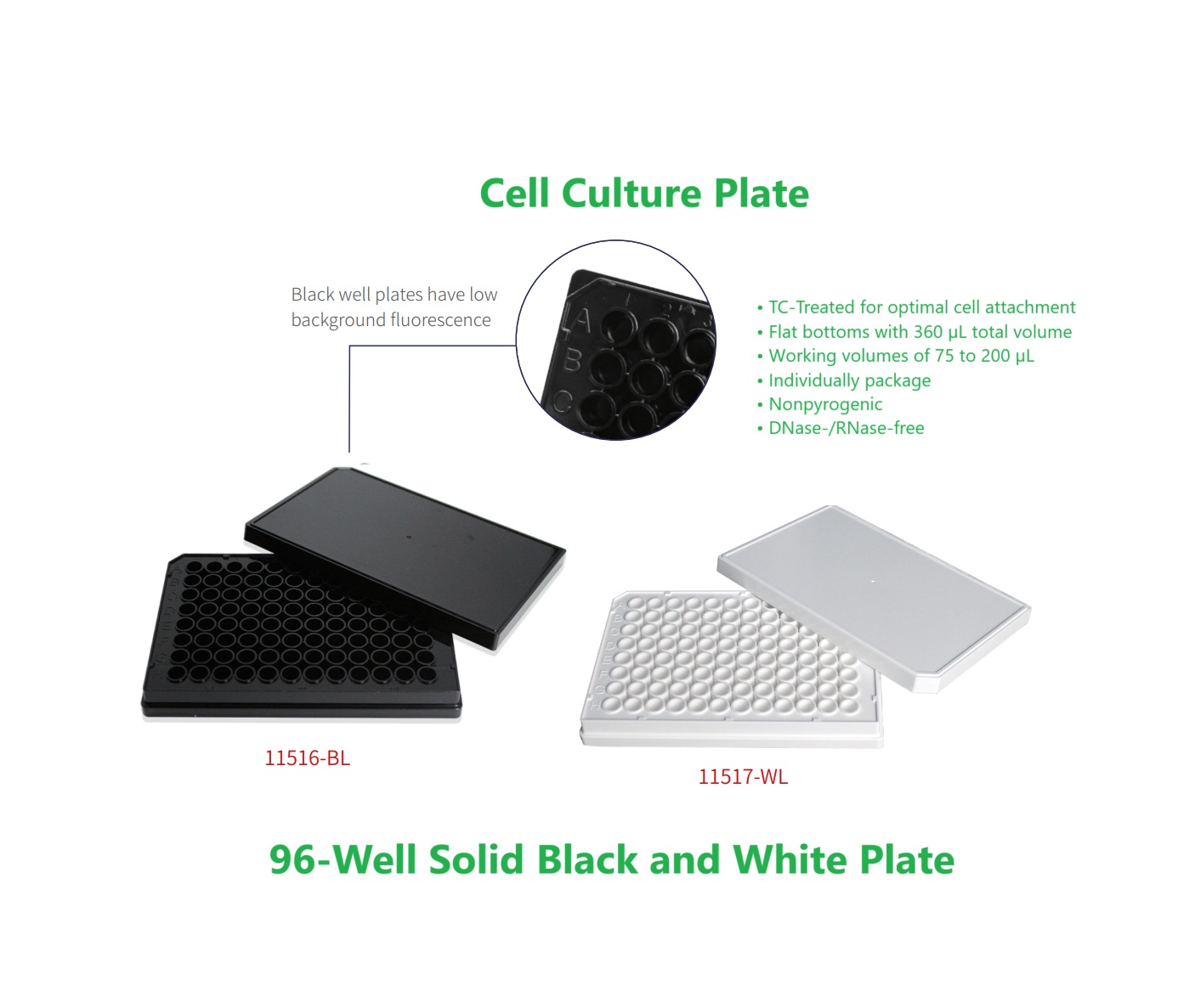 96-well cell culture plates, black frame/white frame, black bottom/white background, black lid/white cap, suitable for fluorescence and autoluminescence detection, reducing fluorescence detection background and cross-interference.