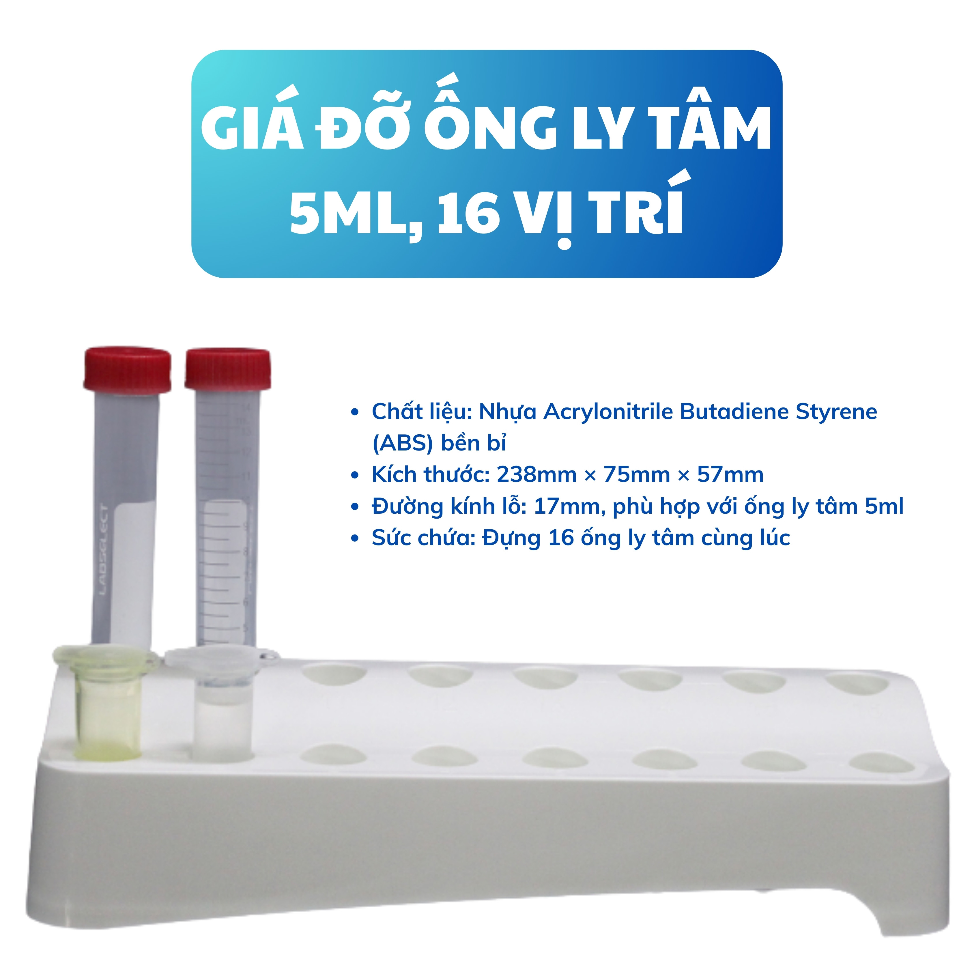 - Sức chứa: Đựng 16 ống ly tâm cùng lúc