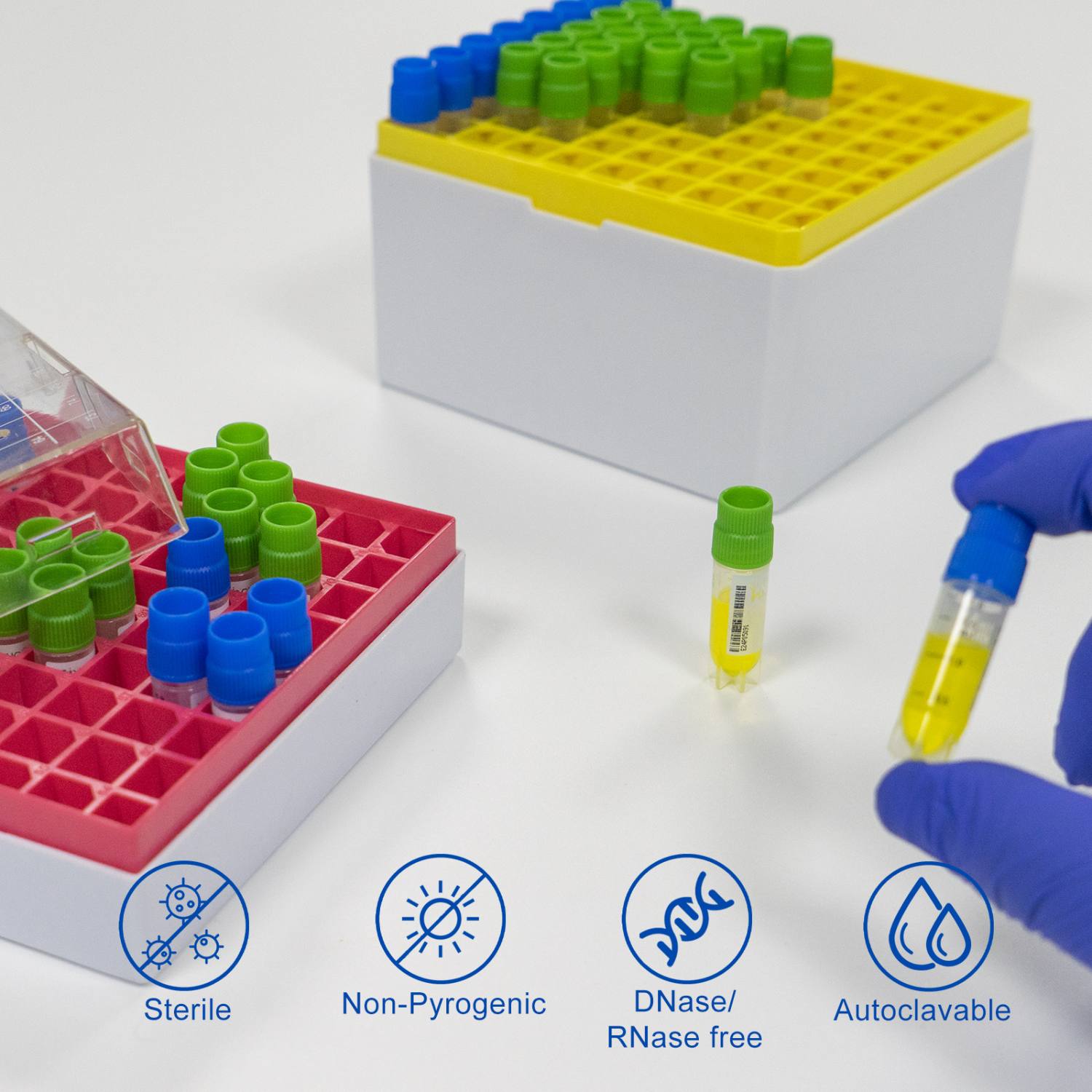 - Gamma radiations sterilized, DNase & RNase free, endotoxin free, foreign DNA free.