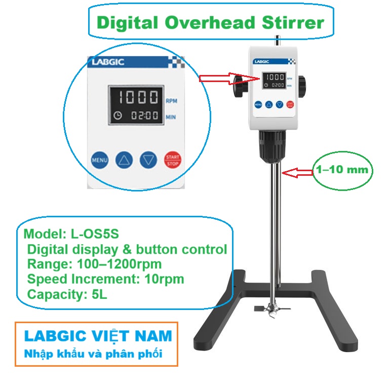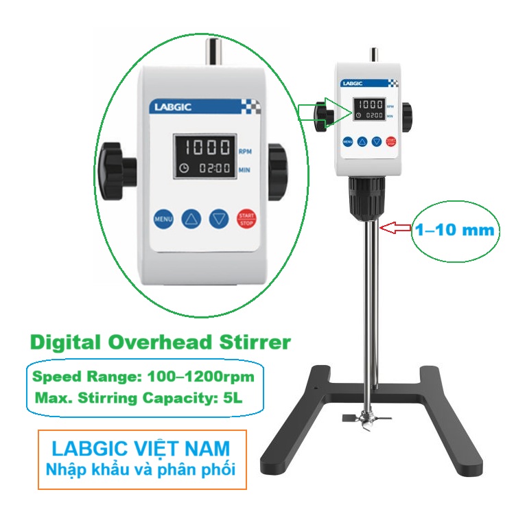 - Đường kính kẹp trục cánh khuấy: 1-10 mm
