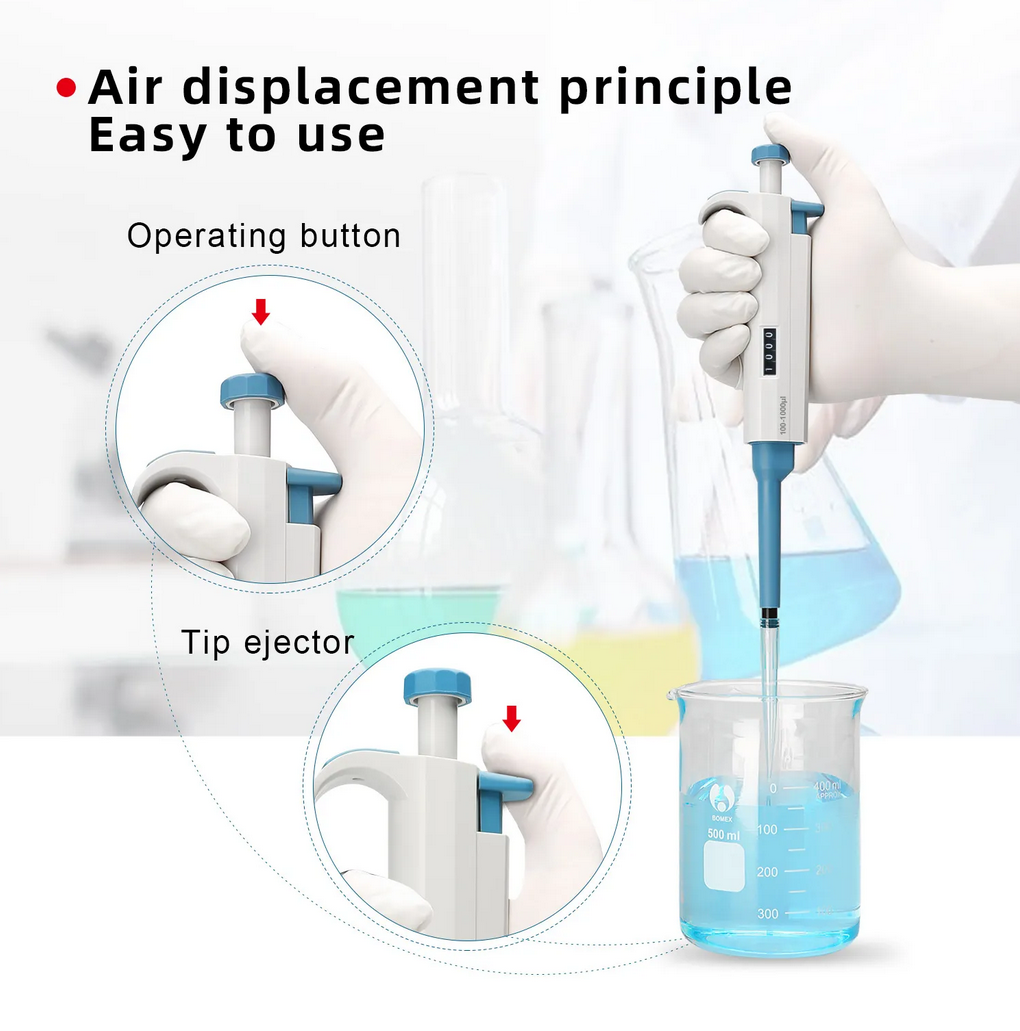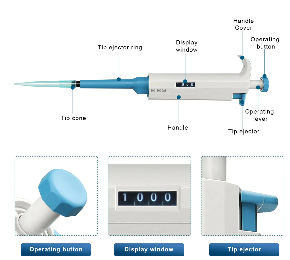 Khoảng điều chỉnh: 0.1-2.5μL, 0.5-10μL, 2-20μL, 5-50μL, 10-100μL, 20-200μL, 100-1000μL, 500-5000μL.