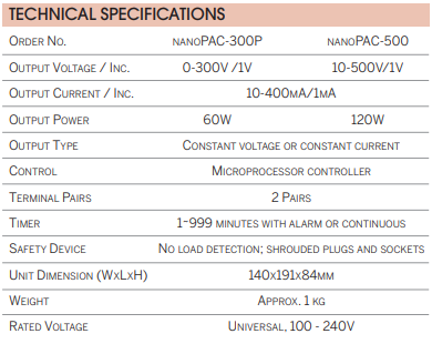 Bộ nguồn điện di mini nanoPAC là một thiết bị siêu nhỏ gọn và kinh tế, lý tưởng để sử dụng với các hệ thống điện di DNA (Ngang) và Protein (Dọc). Với các tính năng nâng cao, chẳng hạn như điện áp không đổi tối đa lên đến 300 hoặc 500V và đầu ra dòng điện không đổi tối đa 400mA, nanoPAC’s có khả năng chạy tất cả các hệ thống MultiSUB ™ ngang của Cleaver Scientific và omniPAGE ™ mini dọc. NanoPAC-500 cũng có khả năng chạy các đơn vị thẳng đứng VS10W & VS20WAVE, cũng như các bể chứa gel ngang và dọc của các nhà sản xuất khác, Chúng có thể được thiết lập chạy liên tục hoặc cài đặt thời gian lên đến 999 phút. Giao diện thân thiện với người dùng của nanoPAC có thể dễ dàng điều chỉnh ở các bước tăng 1V và 1mA, làm cho nó trở nên hoàn hảo cho các phân cách nơi yêu cầu cài đặt chính xác. Kích thước siêu nhỏ gọn của nó và hai cặp đầu nối nguồn song song, có thể chạy hai thiết bị điện di đồng thời, tiết kiệm thời gian và không gian cho băng ghế.